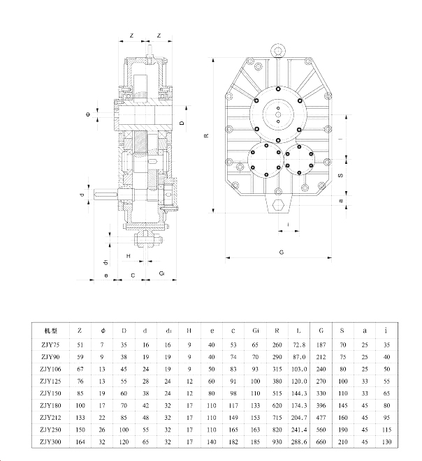 全系列减速器以低速级中心距(mm)为单位,共有75、90、106、125、150,180、212、250、300九种规格。每一规格的传动比有10、11.2、12.5、14、16、18、20、22.4、25九种。