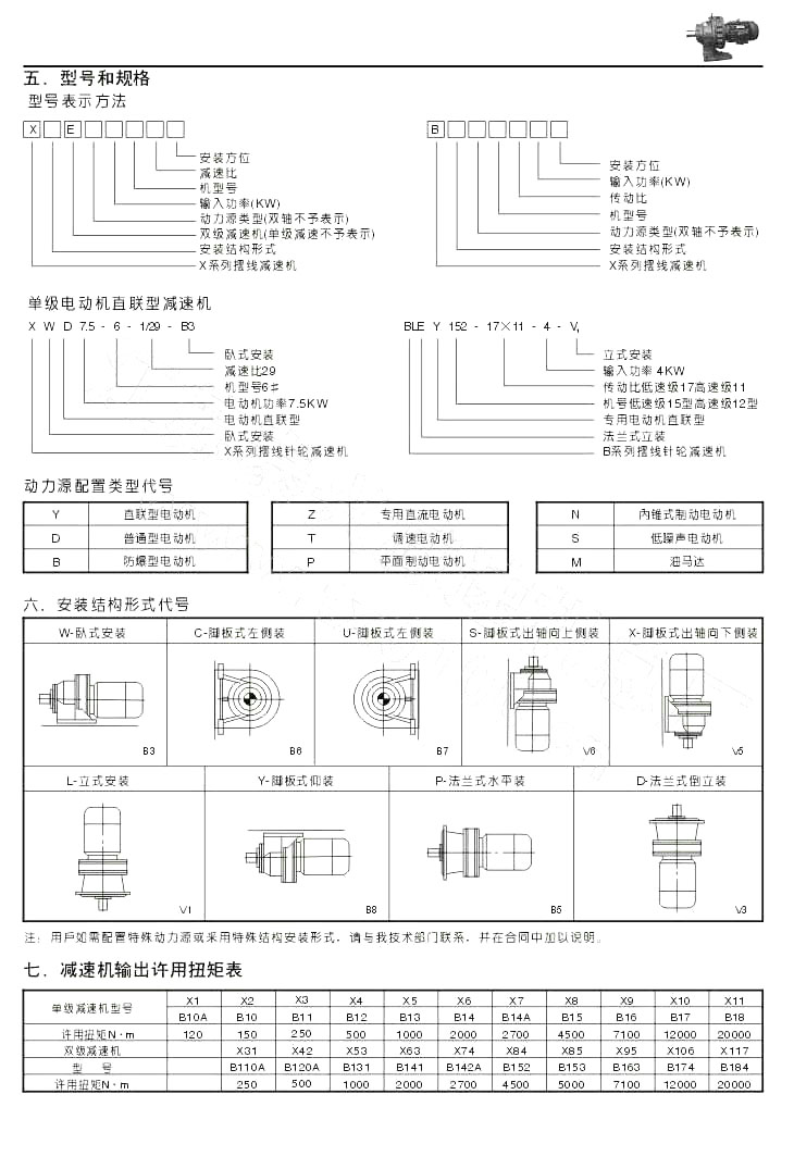| 机型号和规格表示法安装结构形式代号减速机输出许用扭矩表 |