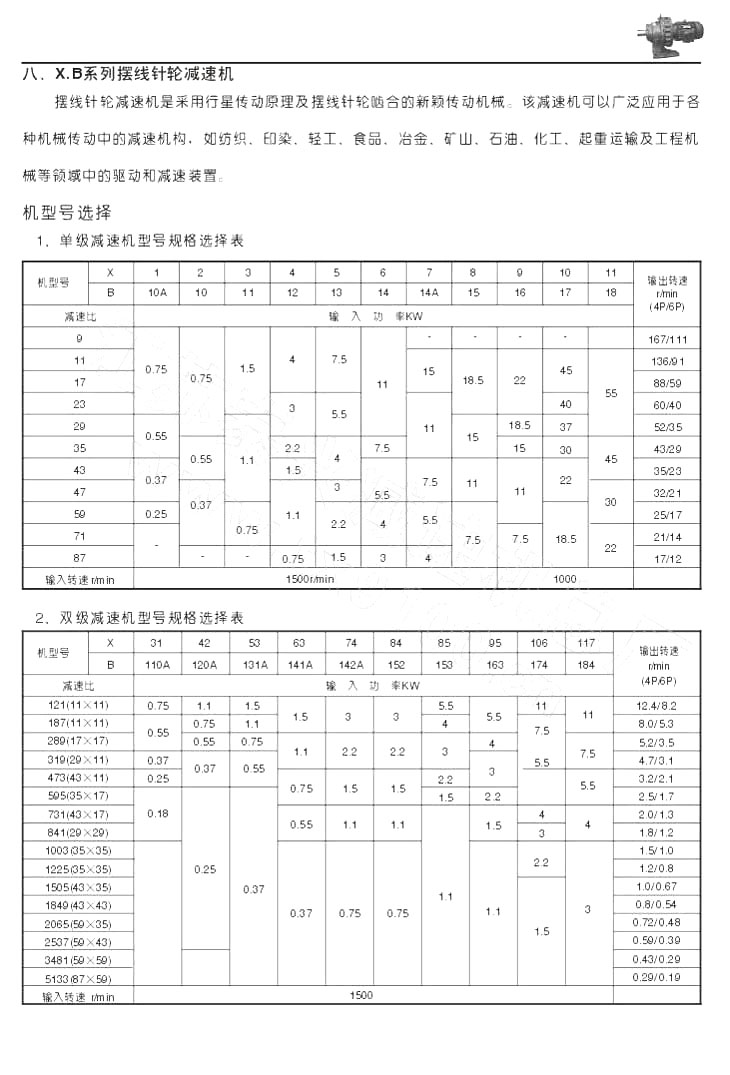 | X.B摆线针轮减速机说明单级减速机型号规格选择表双级减速机型号规格选择表 |