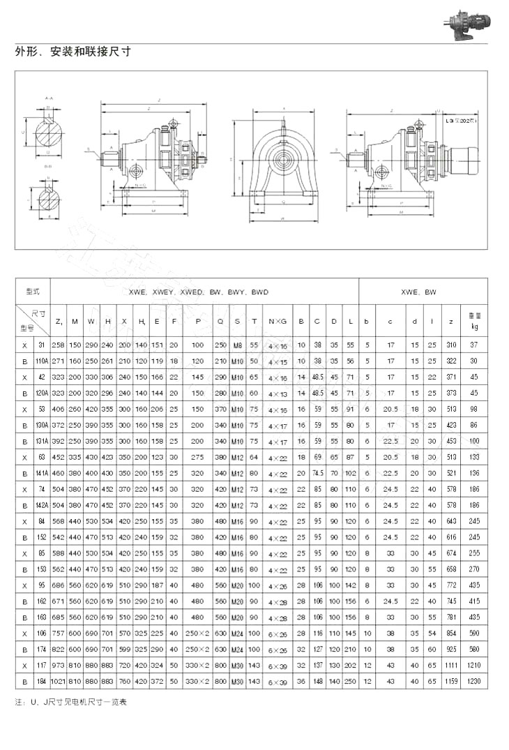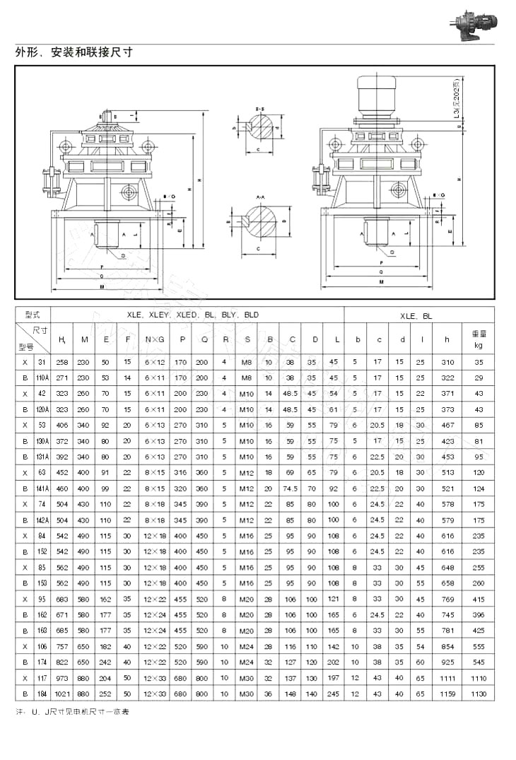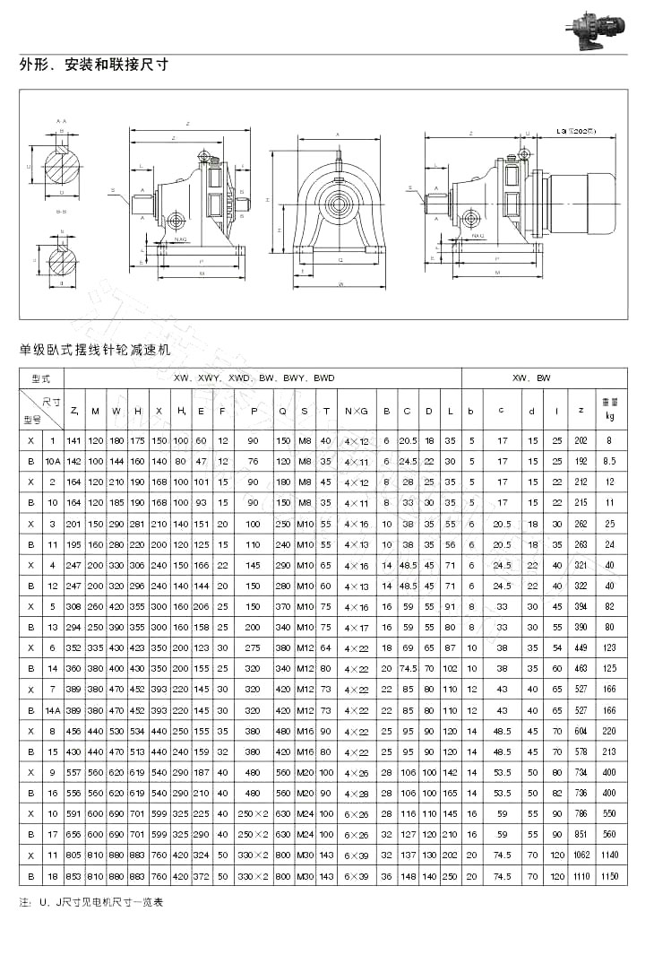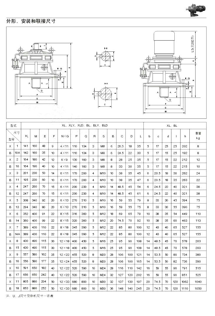 X.B摆线针轮减速机外型图,安装和联结尺寸三
