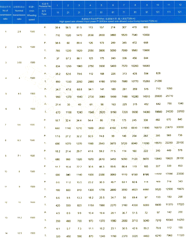 本标准减速器的承载能力受机械强度和热平衡许用功率两方面的限制,因此减速器的选用必须通过两个功率表。首先按减速器机械强度公称输入功率P1先用,如果减速器的实用输入转速与承载能力表中的四档(1500,1000,750,600)转速之某一档转速相对误差不超过4%,可按该档转速下的公称功率选用相当规格的减速器。如果转速相对误差超过4%,则应按实际转速折算减数器的公称功率选用。然后校核减速器热平衡许用功率。