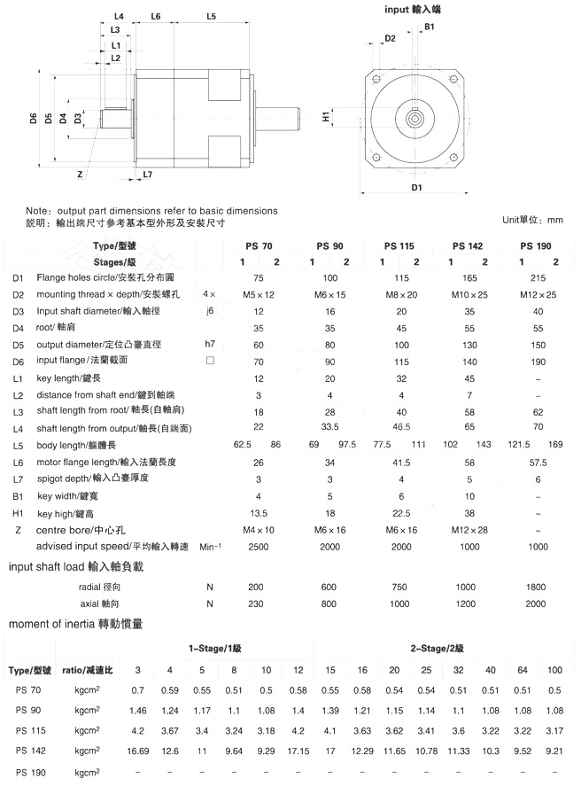 PS SERIES PRECISION PLANETARY GEAR BOXES BASIC DIMENSIONS