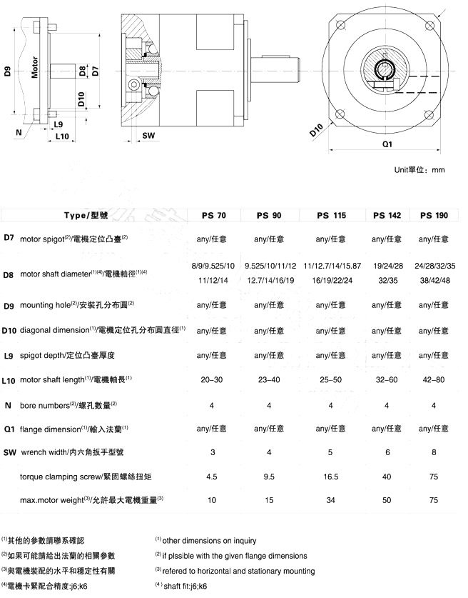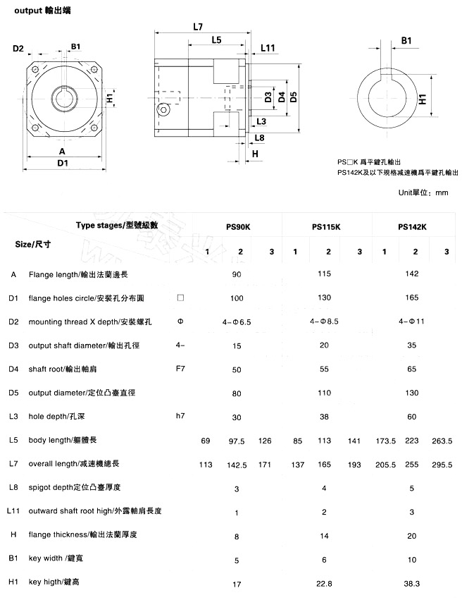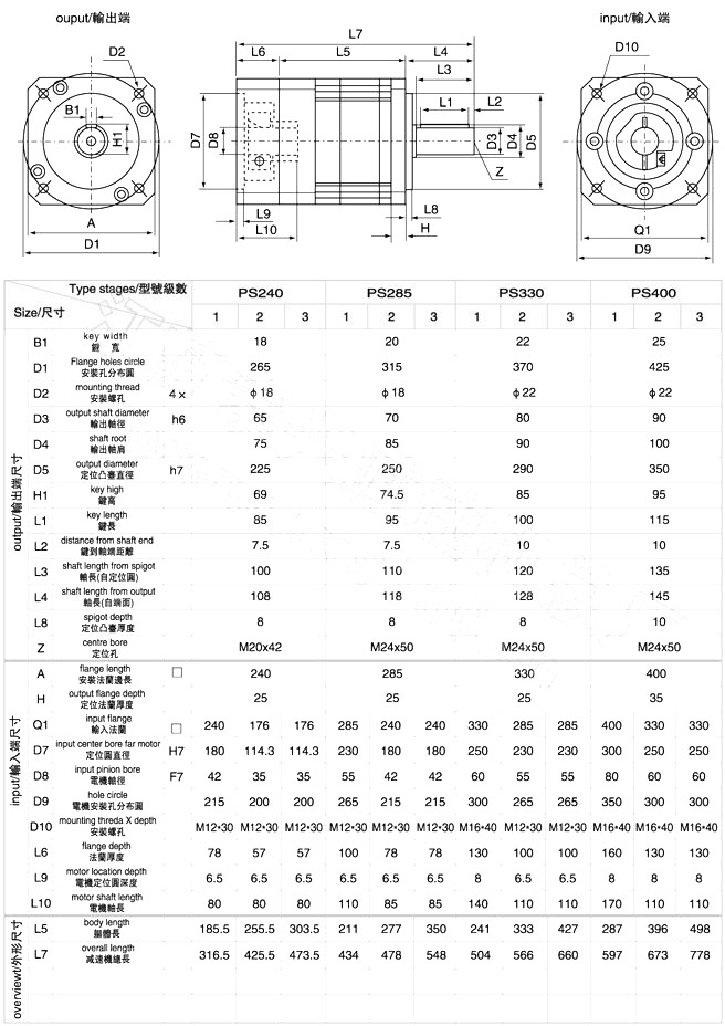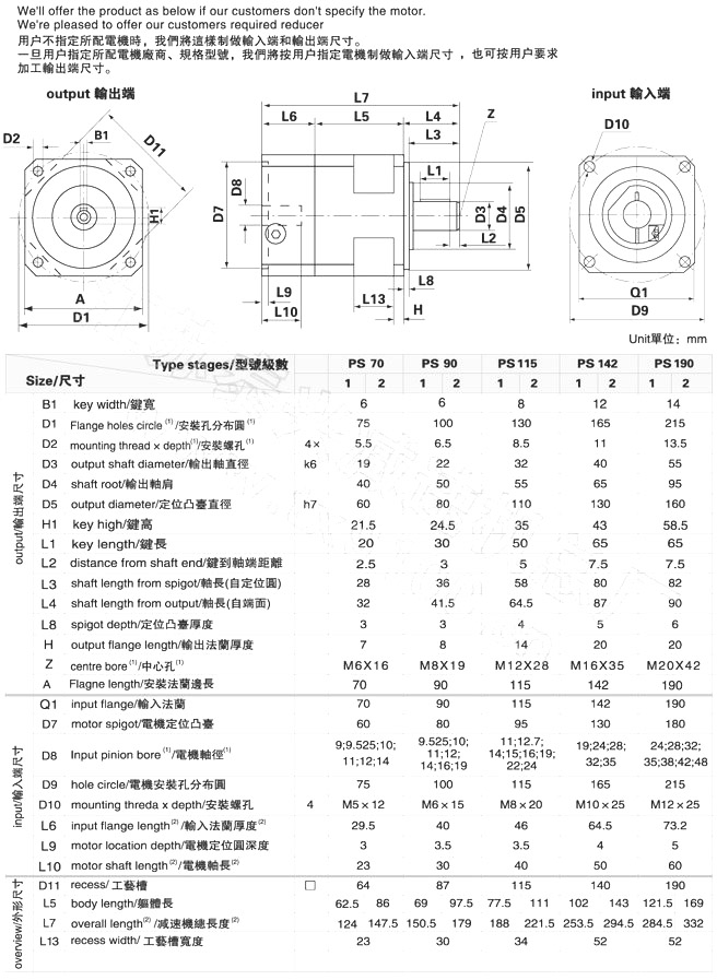 | PS/OP1 系列精密行星减速机任意输入轴型外形安装尺寸 |