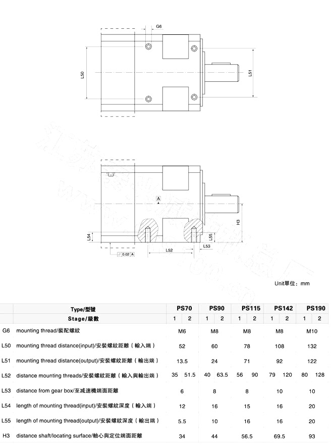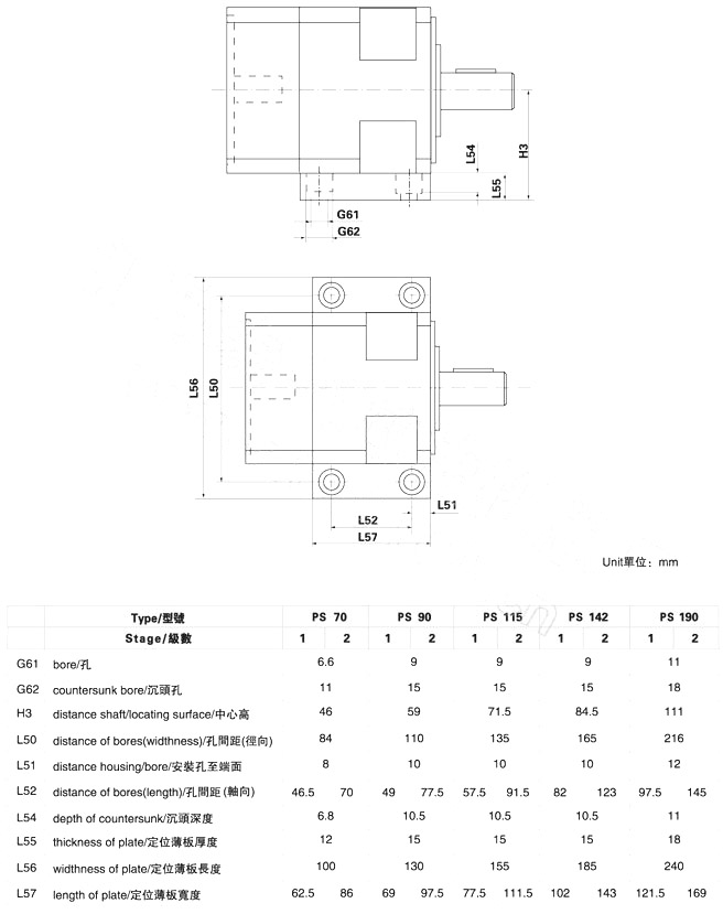 PS/OP3 系列精密行星减速机箱体装配时的安装尺寸