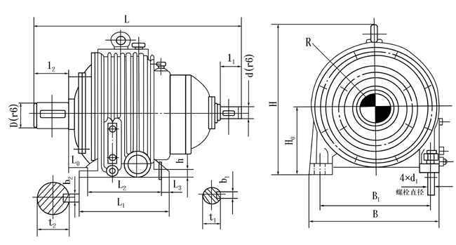 | L | B | H | H0 | R | d | D | l1 | l2 | t1 | b1 | t2 | b2 | L1 | L2 | L3 | L0 | B1 | d1 | h | |||