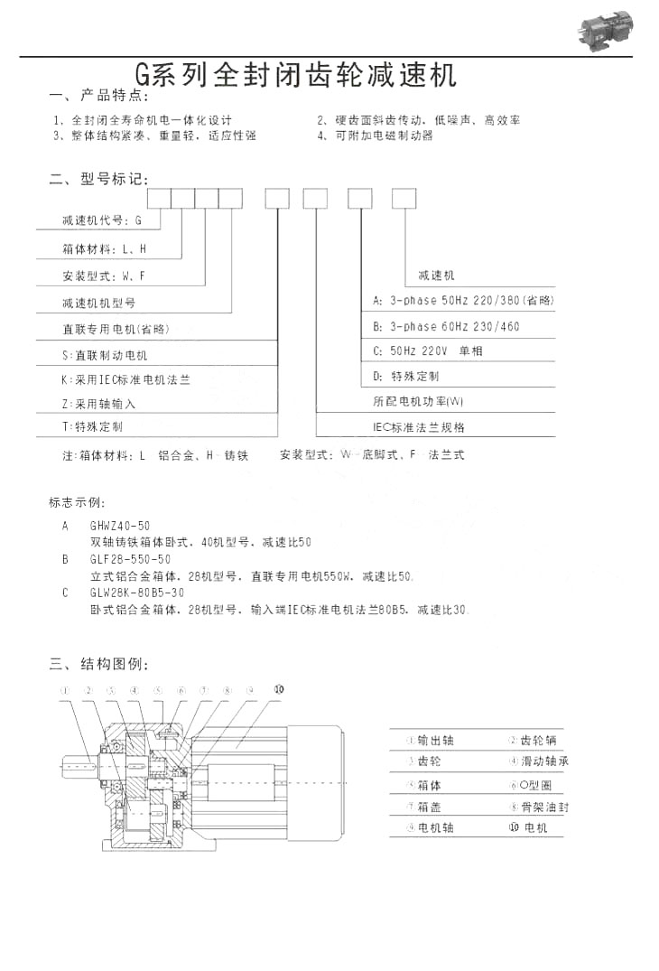 | G系列全封闭齿轮减速机产品特点型号标记结构图例 |